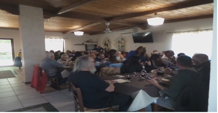 Após o momento de convivência com o almoço comunitário no restaurante da cidade, nos reunimos para um momento de partilha da experiência e para refletir sobre formas de sermos testemunhas de esperança por meio de compromissos concretos. Um forte testemunho de portadores de esperança nos foi dado pela “equipe da fraternidade”, coordenada por Peppe e Franca e formada recentemente entre os Amigos de Crotone. Eles se dedicam a visitar periodicamente Amigos e outras pessoas que não conseguem participar dos encontros e que estão enfrentando dificuldades, especialmente os doentes.